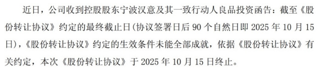 然而近日,良品铺子收到宁波汉意及其一致行动人良品投资的函告,截至《股份转让协议》约定的最终截止日(协议签署后90个自然日,即2025年10月15日),该协议约定的生效条件未能全部成就,依据相关约定,本次《股份转让协议》于2025年10月15日终止。转让事项终止后,良品铺子控股股东仍为宁波汉意,实际控制人仍为杨红春、杨银芬、张国强和潘继红。