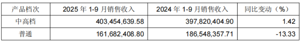 投资时间网、标点财经研究员注意到,2024年前三季度,惠泉啤酒中高档产品收入同比微增1.56%,普通产品收入下滑超2%。到了2025年前三季度,中高档产品收入虽保持增长,但增速仍不高为1.42%,贡献4.03亿元,收入占比七成;普通产品销售收入降幅拉大,为13.33%,贡献了1.62亿元。