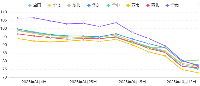 农业农村部全国重点农产品市场信息平台数据显示,10月以来生猪(猪肉)生产价格整体仍处于下行区间,10月22日生猪生产价格(线上)为11.47元/公斤,较9月底的12.59元/公斤进一步下降。根据中国养猪网数据,10月22日,生猪(外三元)价格11.49元/公斤,已跌破多数养殖主体13元/公斤—14元/公斤的成本线。