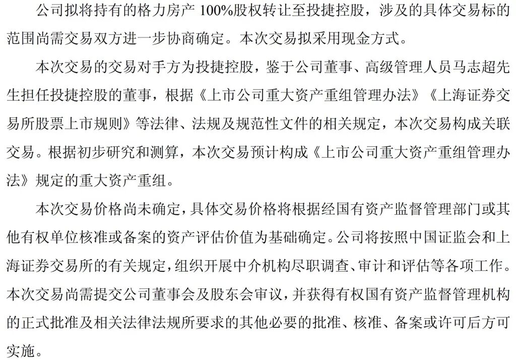 2025年10月22日,珠海珠免集团股份有限公司(下称珠免集团,600185.SH)发布公告称,拟将公司所持有的格力房产100%股权以现金方式转让至投捷控股。本次交易不涉及发行股份,目前尚处于筹划阶段。