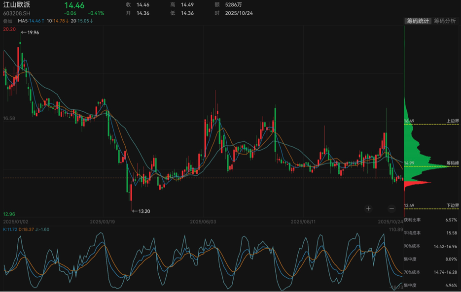 随着管理层变动和公司业绩下滑,二级市场对江山欧派的态度也有所变化。截至10月24日收盘,该公司股价报14.46元/股(不复权),年初以来股价累计下跌超两成。