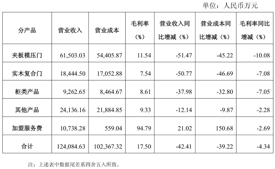 今年前三季度,江山欧派夹板模压门、实木复合门、柜类产品及其他产品实现营收分别为6.15亿元、1.84亿元、0.93亿元、2.41亿元,同比增长分别为-51.47%、-50.77%、-4.40%、-37.98%、-12.14%,全部呈负增长,仅有加盟服务费实现增长,期内营收为1.07亿元,同比增长21.02%。