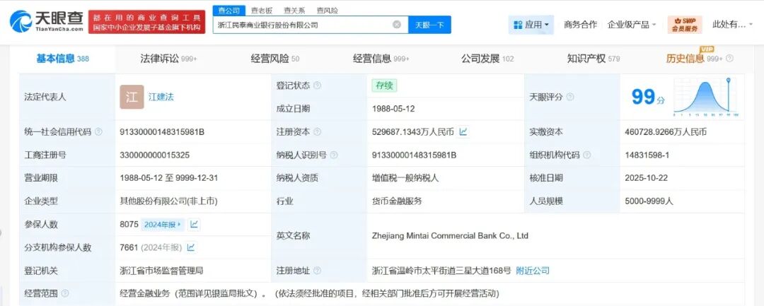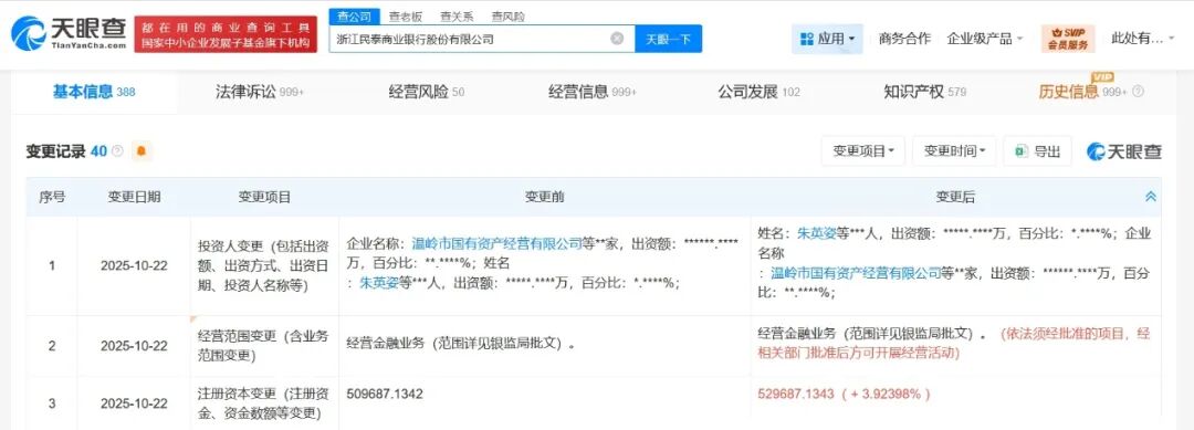 天眼查工商信息显示,近日,浙江民泰商业银行股份有限公司发生工商变更,注册资本由约51亿人民币增至约53亿人民币。