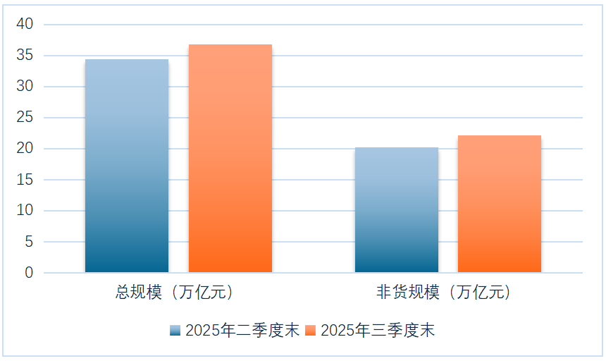 自去年“9ž24”行情启动,A股市场持续回暖。今年4月份以来更是攻势凌厉,上证指数一鼓作气突破4000点,不仅激活了权益类资产的投资价值,更为公募行业注入强劲增长动能。据Wind数据统计,截至2025年三季度末,公募行业总规模为36.74万亿元,较二季度末增长2.35万亿元。其中,三季度末非货规模达到22.08万亿元,较二季度末增长1.91万亿元。