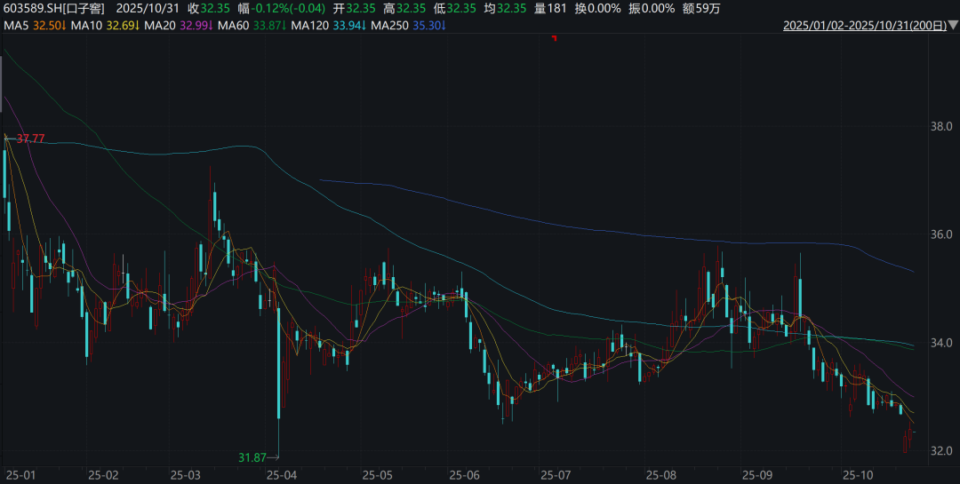 二级市场方面,业绩公布后次日,口子窖股价开盘即下跌近3%,开盘价31.96元/股(不复权,下同)创下今年以来最低值。截至10月30日收盘,口子窖微涨0.4%,报32.39元/股,年内股价下跌14.36%,总市值为193亿元。