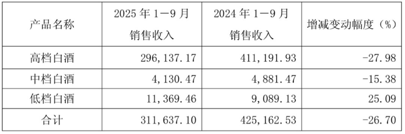 2025年前三季度口子窖按产品档次分类收入及同比变动情况(万元)
