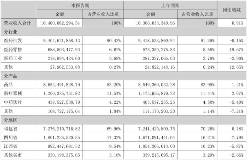 鹭燕医药增收难增利的情况其实已有显现。据半年报披露信息,鹭燕医药得以在医药行业的波动中实现营收增长,与其旗下零售药房的大幅增长有很大关系。从收入构成来看,公司的支柱业务为医药批发,上半年该板块贡献了九成的收入,但收入贡献同比下滑了0.15%;反观营收占比6.62%的医药零售板块,实现了19.67%的同比增速。