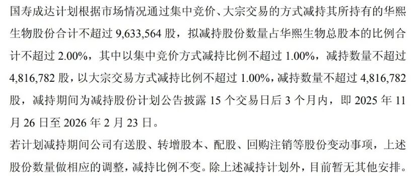 2025年11月4日,华熙生物科技股份有限公司(下称华熙生物,688363.SH)公告称,公司大股东国寿成达计划于2025年11月26日至2026年2月23日期间,通过集中竞价、大宗交易的方式减持所持有的华熙生物股份合计不超过963.36万股,占华熙生物总股本的比例合计不超过2%。若按11月5日50.06元/股收盘价计算,股东国寿成达此次拟套现4.82亿元。