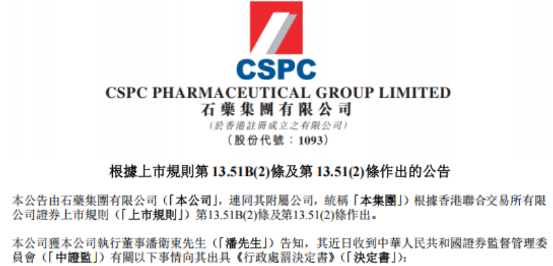 业务压力之外,公司内部治理也存问题。日前,石药集团公告称,执行董事潘卫东收到中国证监会出具的《行政处罚决定书》,处罚事由是其违反有关规定,相关行为构成证券法下的内幕交易,故对其处以500万元的罚款。