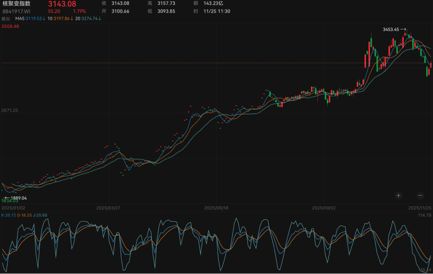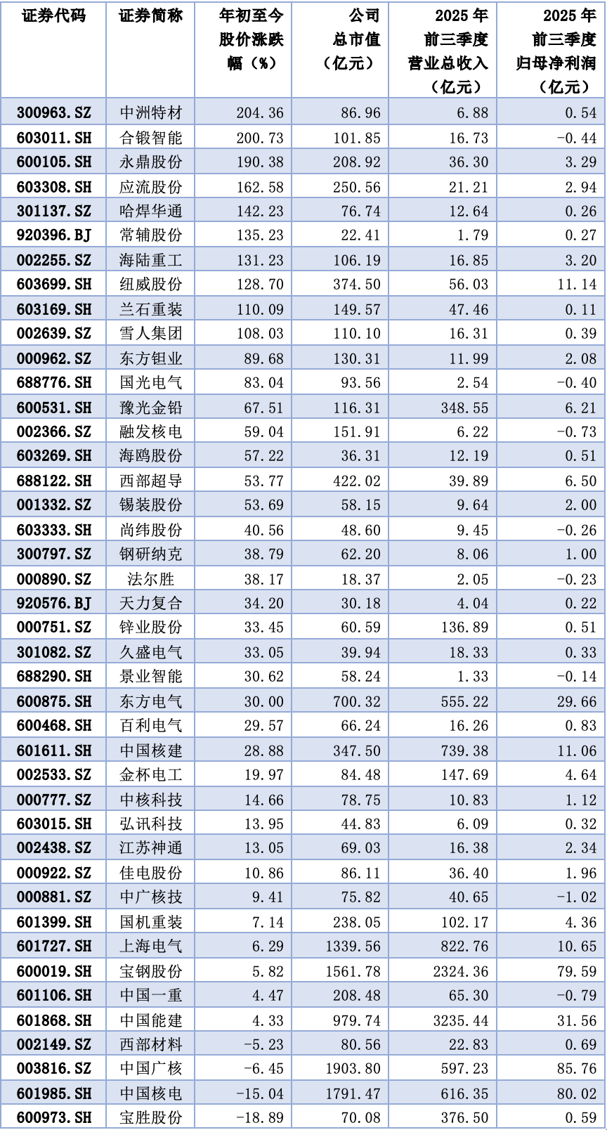 从股价走势来看,据Wind统计数据,2025年年初至11月24日期间,中洲特材股价涨幅最高,达204.36%,紧随其后的是合锻智能,股价涨幅为200.73%,此外涨幅实现翻倍的个股共有8只。股价呈下滑走势的个股共有4只,依次为西部材料(002149.SZ)、中国广核(003816.SZ)、中国核电(601985.SH)、宝胜股份(600973.SH),其中宝胜股份降幅最大,年内下降18.89%。