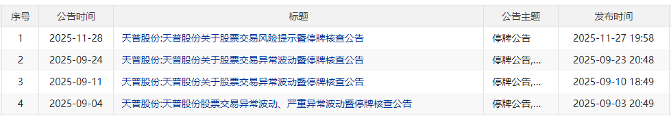 这是10倍股天普股份(605255.SH)第四次停牌核查。