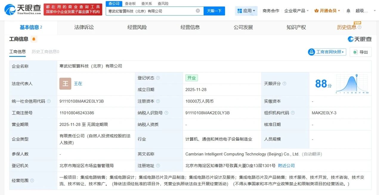 天眼查App显示,近日,寒武纪智算科技(北京)有限公司成立,法定代表人为王在,注册资本1亿人民币,经营范围包括集成电路设计、集成电路芯片及产品制造、集成电路芯片设计及服务等。
