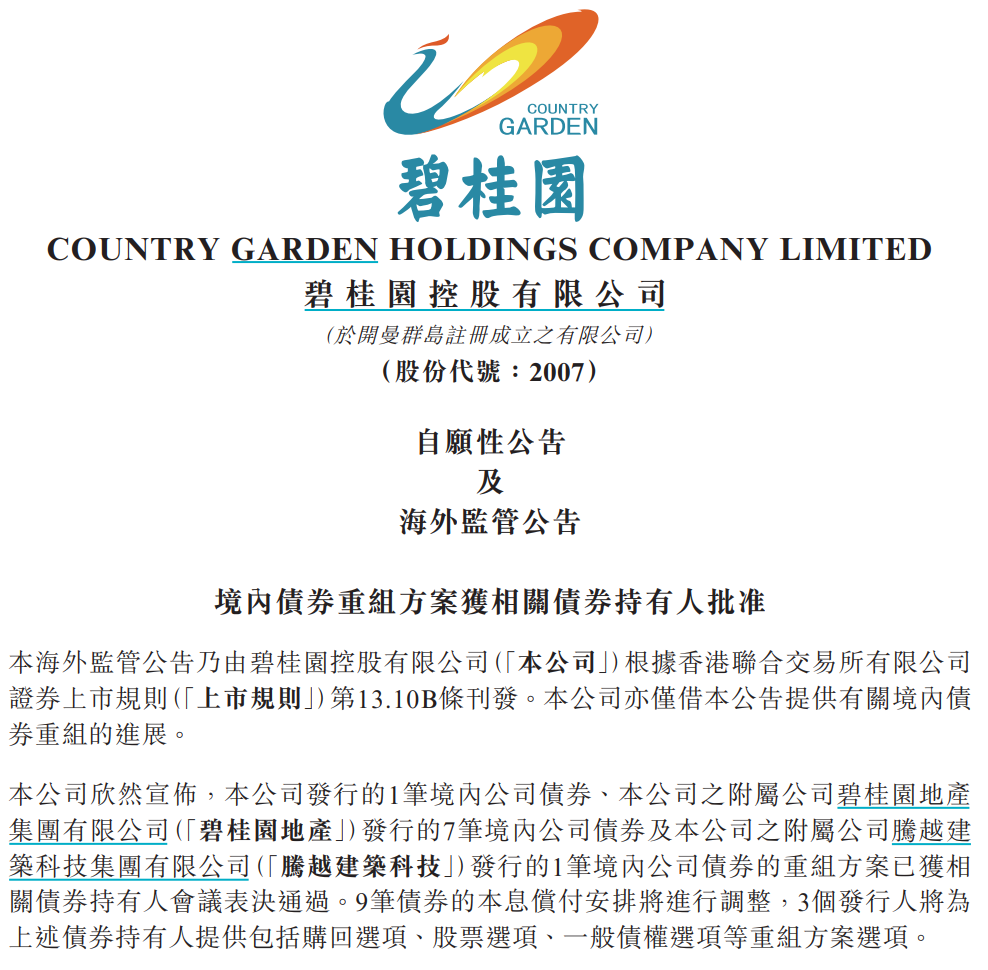 境内外债务重组相继落地!降债或超900亿元,碧桂园轻装转身