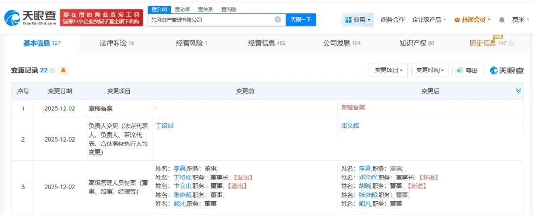 天眼查App显示,近日,东风资产管理有限公司发生工商变更,丁绍斌卸任法定代表人、董事长,由邓文辉接任,同时部分高管发生变更。