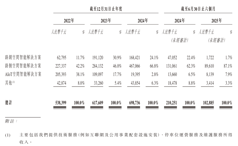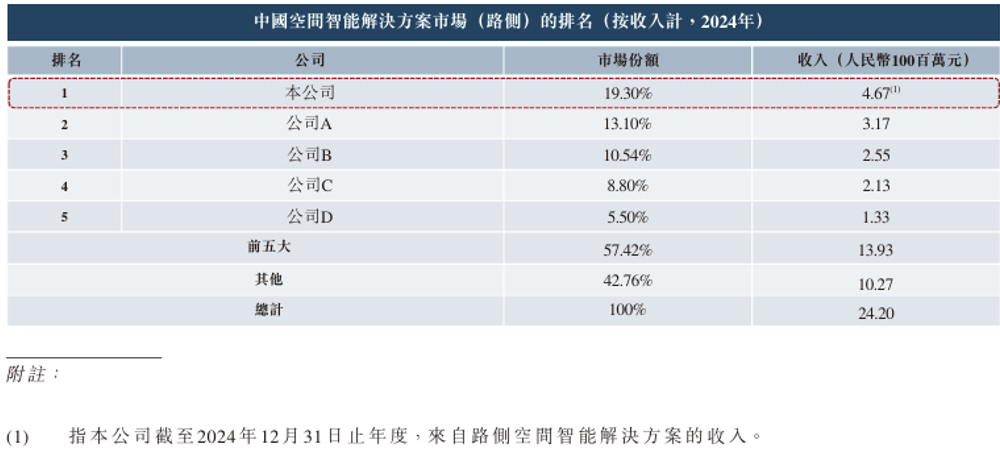 投资时间网、标点财经研究员查阅招股书注意到,智慧互通旗下拥有SUPER VISION(超视线)、AITS(爱通行)、AIPARK(爱泊车)、AIC(爱充电)、AIPILOT(领航者)五大品牌。据弗若斯特沙利文资料显示,以收入计,2024年智慧互通在中国智慧交通行业内的所有空间智能解决方案提供商中排名第四,占有6.6%的市场份额;在中国智慧交通行业内的所有空间智能路侧解决方案提供商中排名第一,占有19.3%的市场份额。
