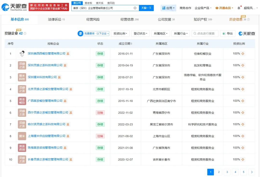天眼查App显示,喜茶关联公司深圳美西西餐饮管理有限公司成立于2016年1月,法定代表人为聂云宸,注册资本1000万人民币,经营范围包括餐饮管理、企业管理、以自有资金从事投资活动等。股东信息显示,该公司由喜茶(深圳)企业管理有限责任公司全资持股。对外投资信息显示,该公司持有34家企业100%股份,多为存续状态,包括广西喜茶餐饮管理有限公司、上海喜创于茶餐饮管理有限公司等。分支机构信息显示,该公司拥有230余家分支机构,其中120余家已注销。
