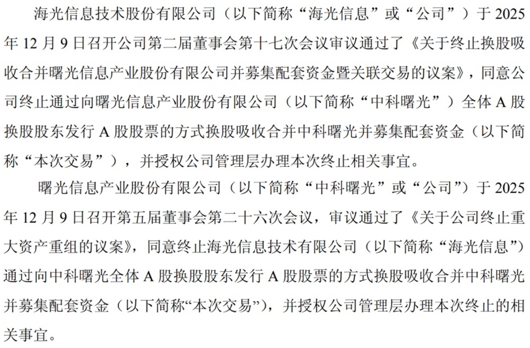 12月9日晚间,海光信息技术股份有限公司(下称海光信息,688041.SH)、曙光信息产业股份有限公司(下称中科曙光,603019.SH)双双发布公告宣布终止重大资产重组。双方表示,这一决策源于本次交易规模大、涉及相关方多,使得重大资产重组方案论证历时较长;并且,目前市场环境较该交易筹划之初发生较大变化,本次实施重大资产重组的条件尚不成熟。