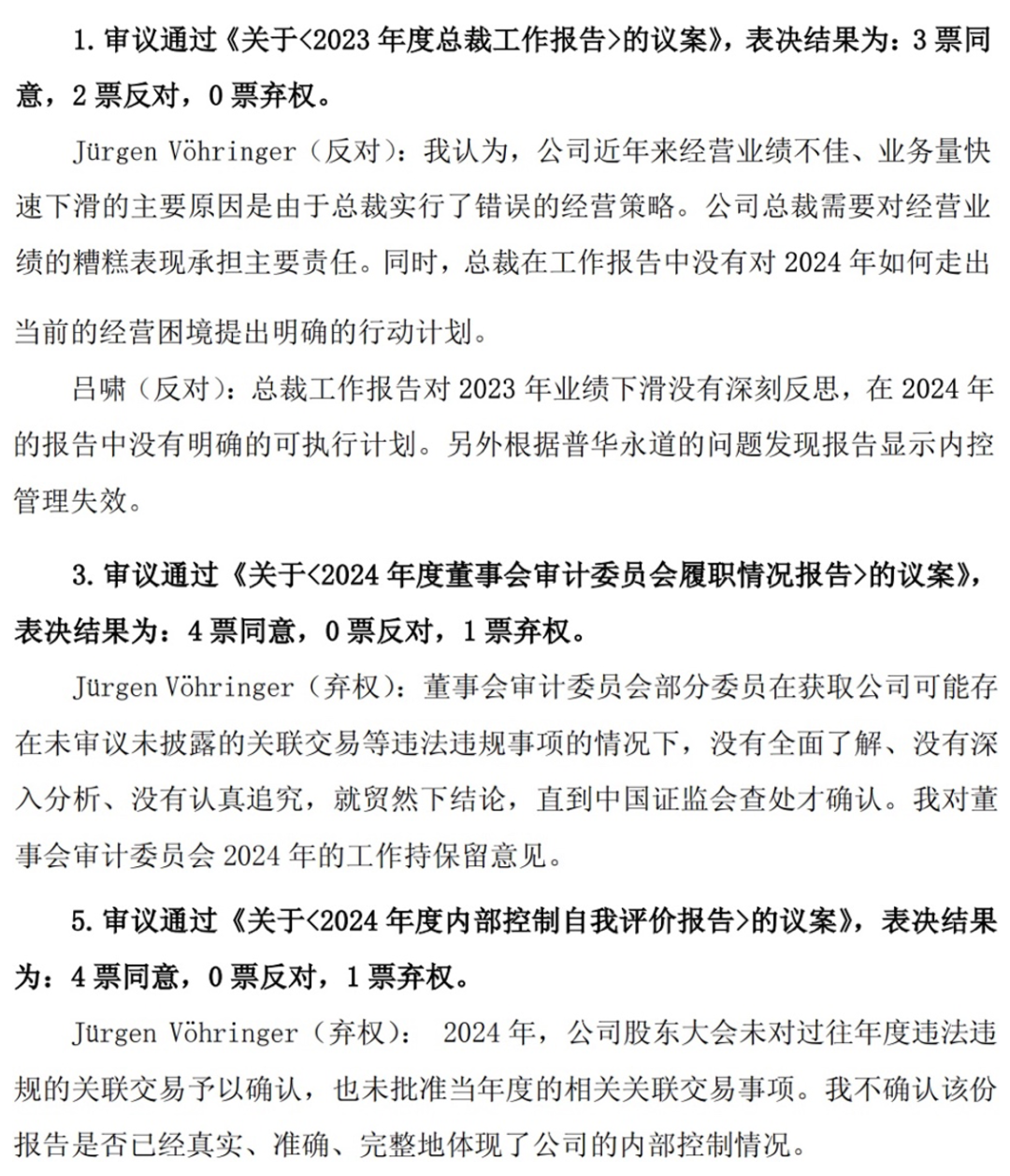早在2024年4月的董事会上,菲林格尔时任德国籍董事长Jürgen Vöhringer(下称Jürgen)就曾对关于2023年度总裁、董事会工作报告、履职情况、内控等多项议案提出反对,他指出公司近年来业绩不佳、业务量快速下滑的主要原因是总裁实行了错误的经营策略,总裁需对此承担主要责任,同时认为公司独立董事未全面了解公司情况,对所存在的诸多问题未进行深刻了解和分析,以及公司内部控制存在一定缺陷。彼时,时任董事吕啸也对部分议案投出反对票。