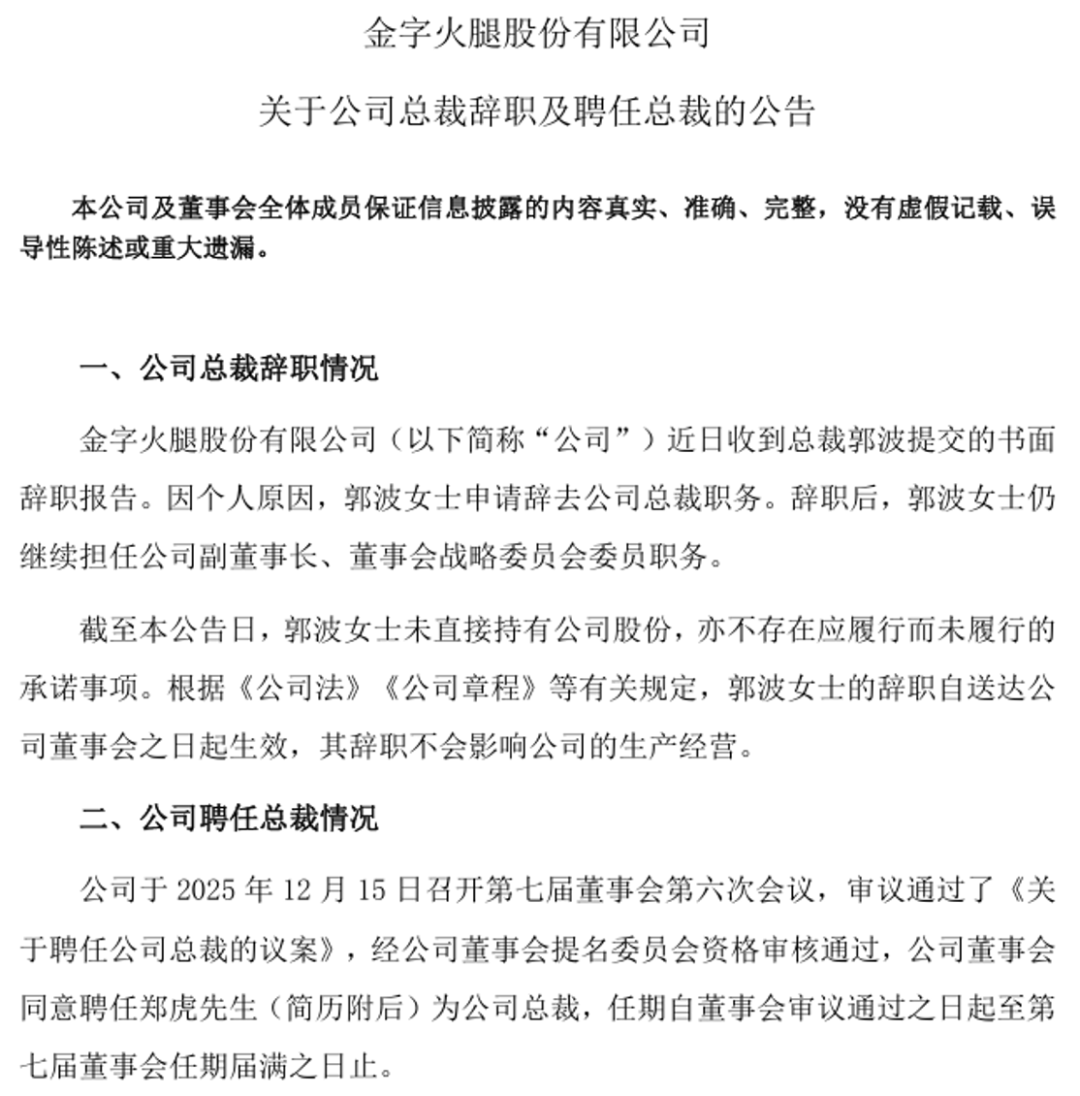 投资时间网、标点财经研究员注意到,郭波曾任渤海证券投行总部SVP、清禾私募基金管理(珠海)有限公司董事长及总经理,2025年7月起任金字火腿副董事长、总裁。也就是说,在上任金字火腿总裁5个月后,他便从任上退下。