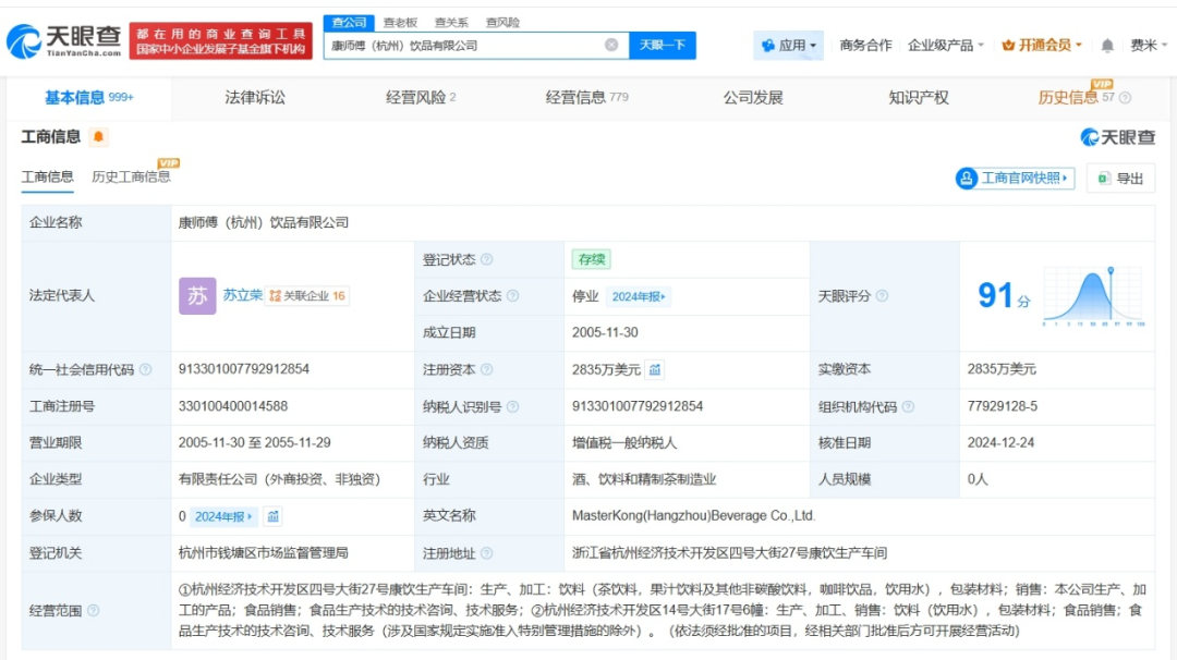 天眼查经营风险信息显示,近日,康师傅(杭州)饮品有限公司新增一则简易注销公告,公告期为12月8日至12月27日。