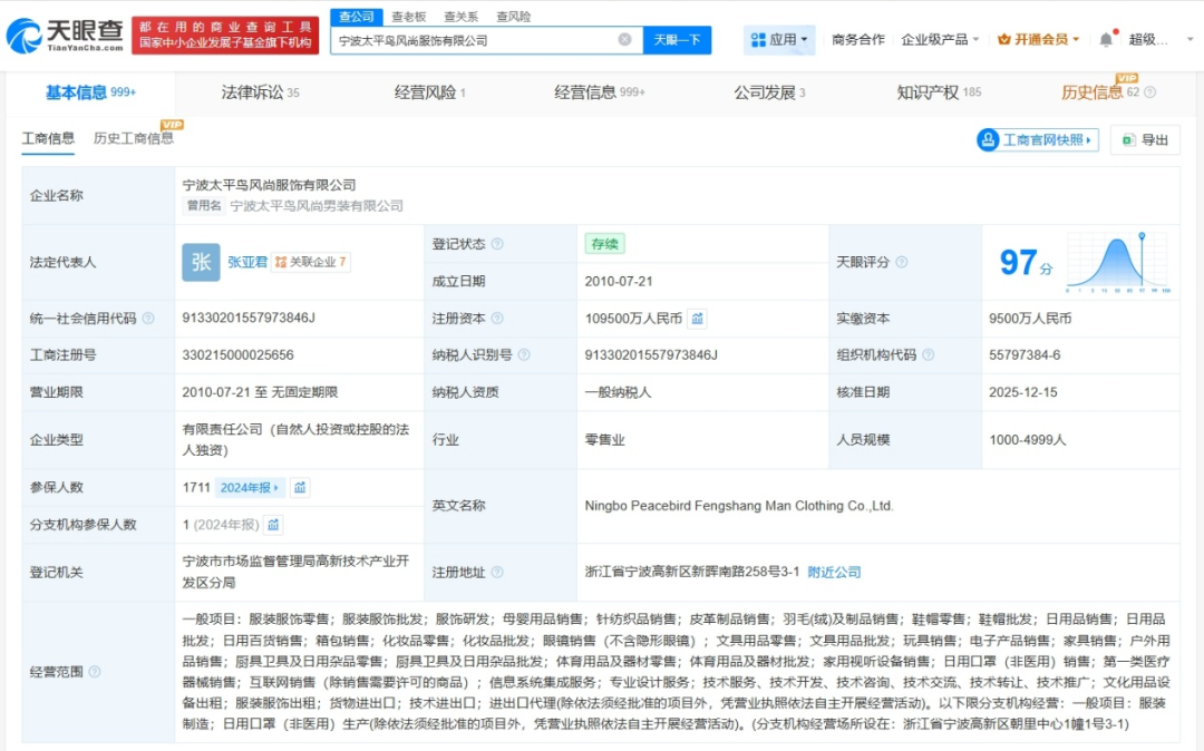 天眼查工商信息显示,近日,宁波太平鸟风尚服饰有限公司发生工商变更,注册资本由9500万人民币增至10.95亿人民币,增幅约1053%。