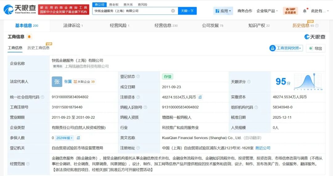 快钱金融服务(上海)有限公司成立于2011年9月,法定代表人为张翼,注册资本约4.8亿人民币,经营范围含金融信息服务,接受金融机构委托从事金融信息技术外包、金融业务流程外包、金融知识流程外包,投资管理,投资咨询,市场信息咨询与调查等。股东信息显示,该公司现由上海儒意星辰企业管理有限公司、 金银凤、杜敏峰等共同持股。