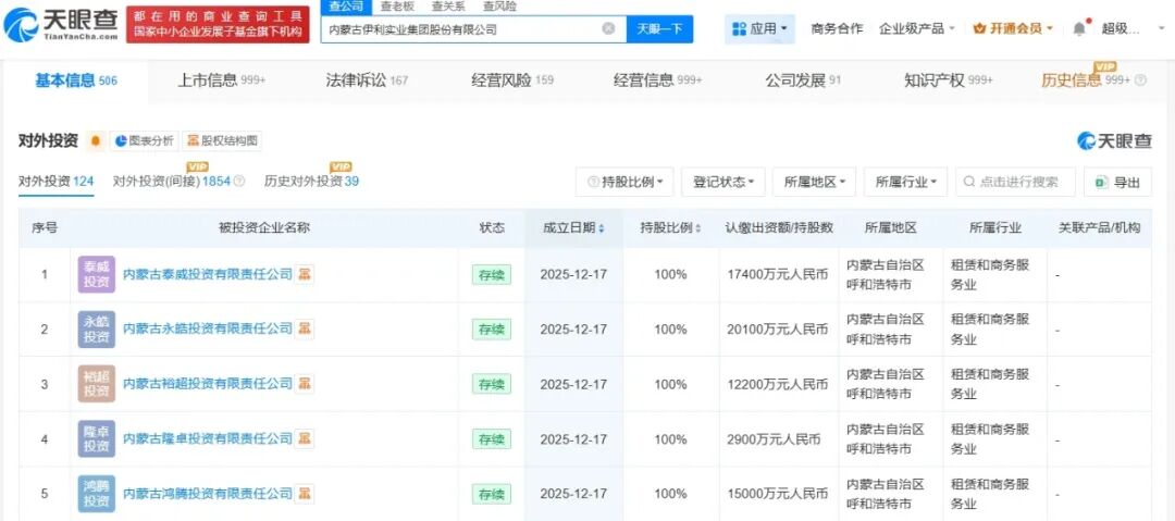 天眼查工商信息显示,近日,内蒙古永皓投资有限责任公司、内蒙古泰威投资有限责任公司、内蒙古鸿腾投资有限责任公司、内蒙古裕超投资有限责任公司、内蒙古隆卓投资有限责任公司成立,法定代表人均为乌云达来,注册资本分别为2.01亿人民币、1.74亿人民币、1.5亿人民币、1.22亿人民币、2900万人民币,经营范围为企业管理、企业管理咨询、以自有资金从事投资活动。股东信息显示,上述公司均由伊利股份(600887)全资持股。