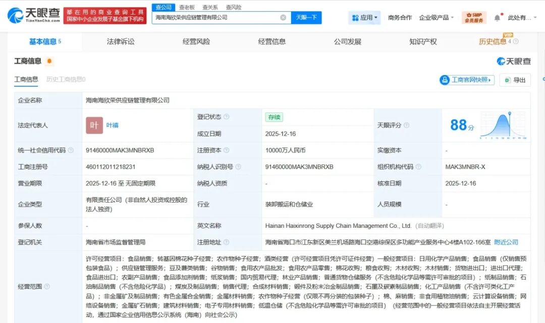 天眼查工商信息显示,近日,海南海欣荣供应链管理有限公司成立,法定代表人为叶禧,注册资本1亿人民币,经营范围含食品销售、转基因棉花种子经营、农作物种子经营、酒类经营、日用化学产品销售、食品销售、谷物销售、食用农产品批发、食用农产品零售、进出口代理、食品进出口、农副产品销售等。股东信息显示,该公司由四川五粮液物产有限公司全资持股。