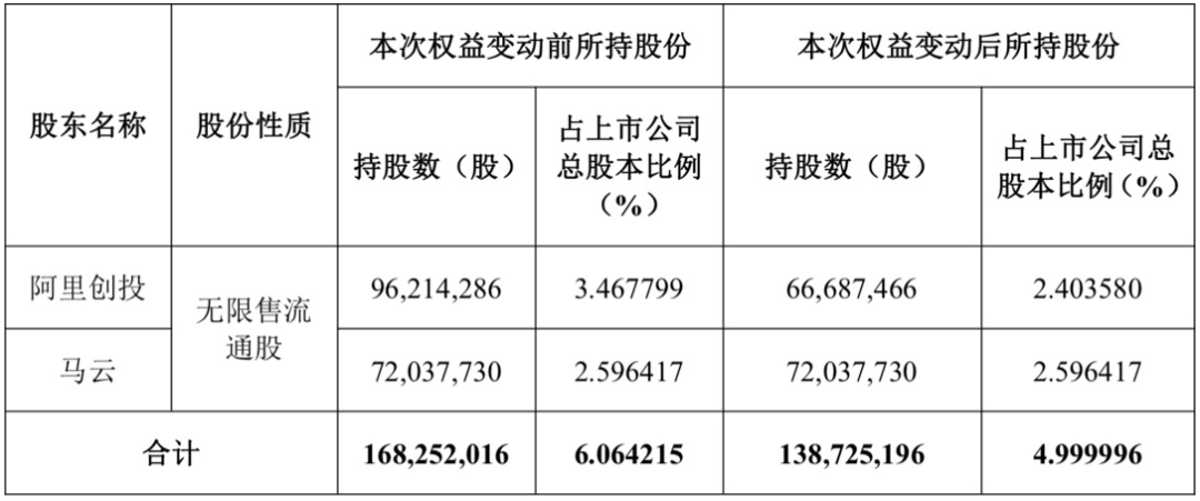 公告显示,阿里创投及其一致行动人马云合计持股比例由6.06%降至4.99%,不再是公司持股5%以上股东