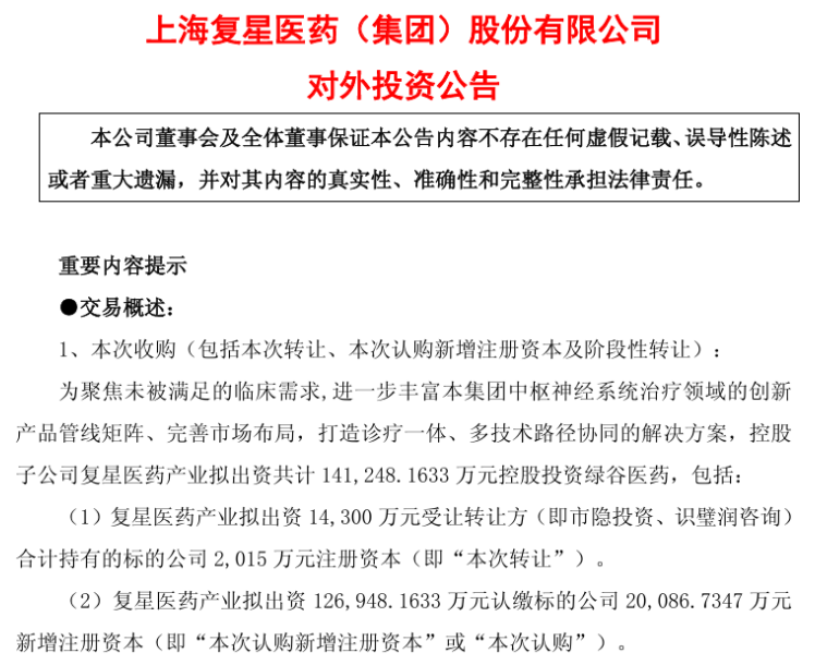 复星医药近日发布的一则重磅公告掀起市场波澜:其控股子公司复星医药产业拟以14.12亿元现金收购绿谷医药控股权,目标直指后者旗下阿尔茨海默病创新药甘露特钠胶囊。这一交易被视为复星医药在中枢神经系统(CNS)领域战略布局的关键落子,旨在通过整合绿谷医药的研发管线,强化其在神经退行性疾病治疗市场的竞争力。