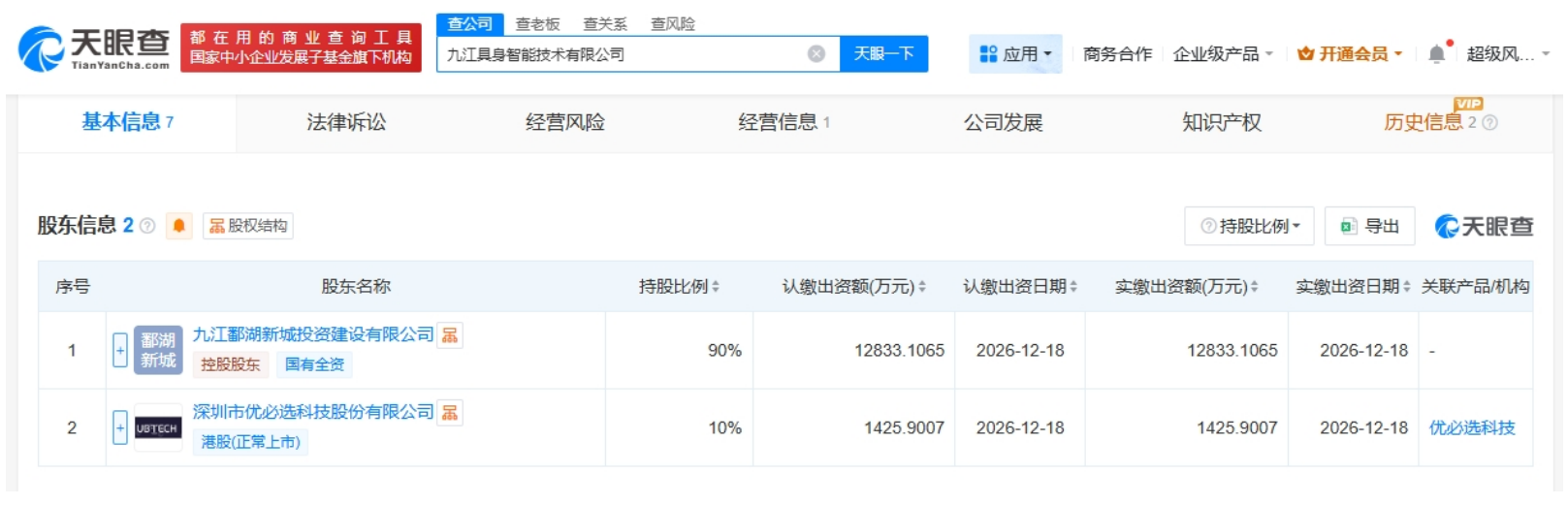 股东信息显示,该公司由九江鄱湖新城投资建设有限公司和优必选(09880.HK)分别持股90%、10%。