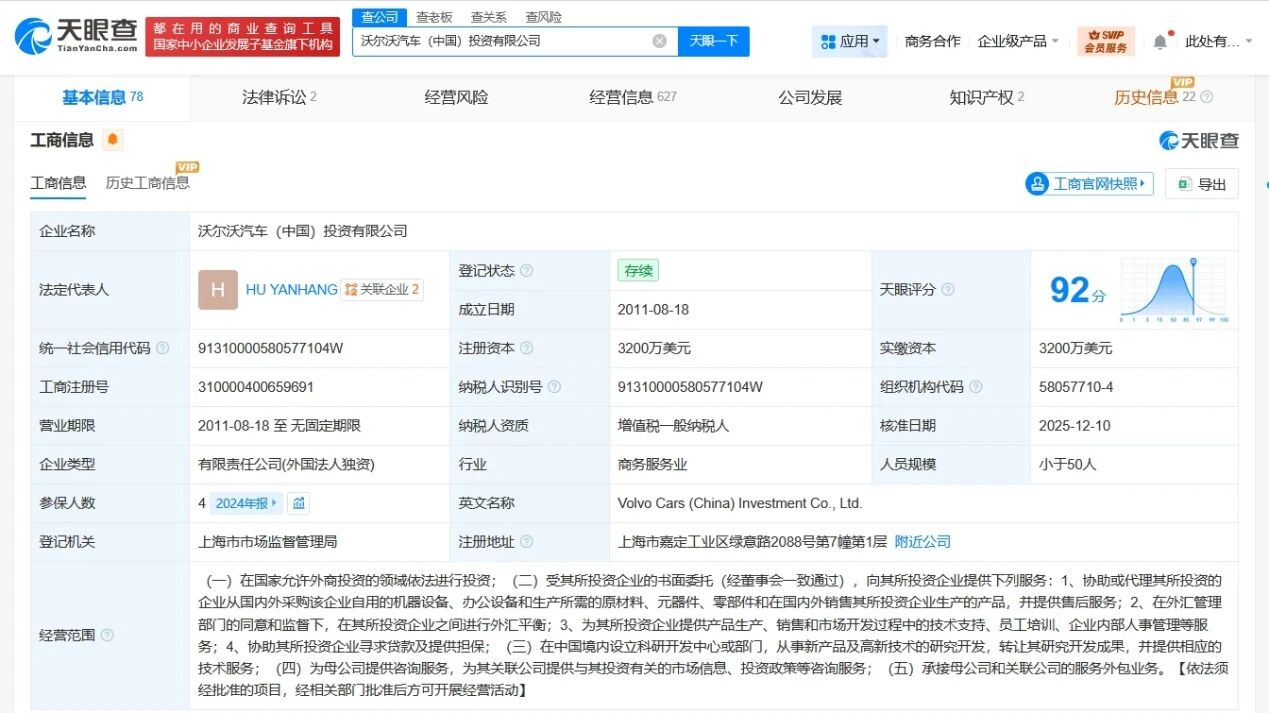 天眼查工商信息显示,近日,沃尔沃汽车(中国)投资有限公司发生工商变更,袁小林卸任法定代表人、董事长,由HU YANHANG接任,同时多位高管发生变更。