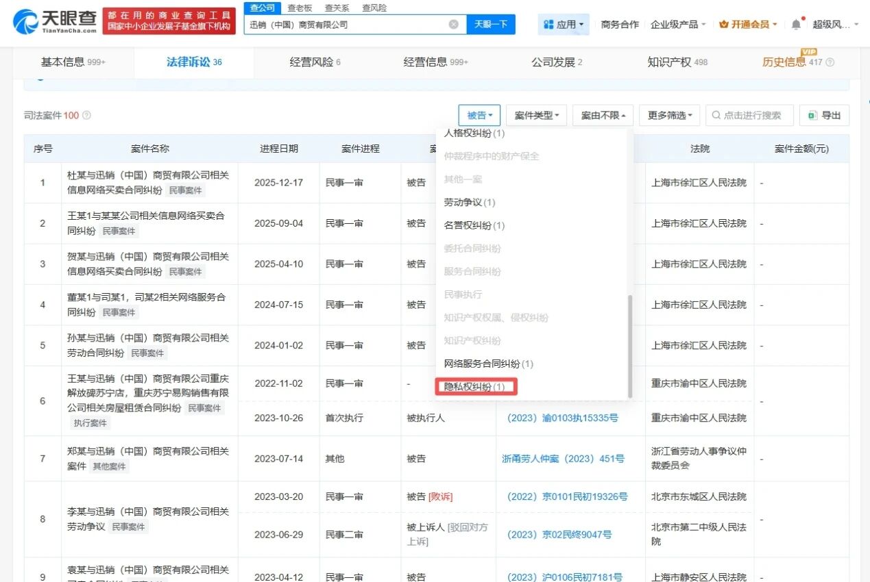 风险信息显示,该公司曾因隐私权纠纷被起诉,并涉及多起买卖合同纠纷。