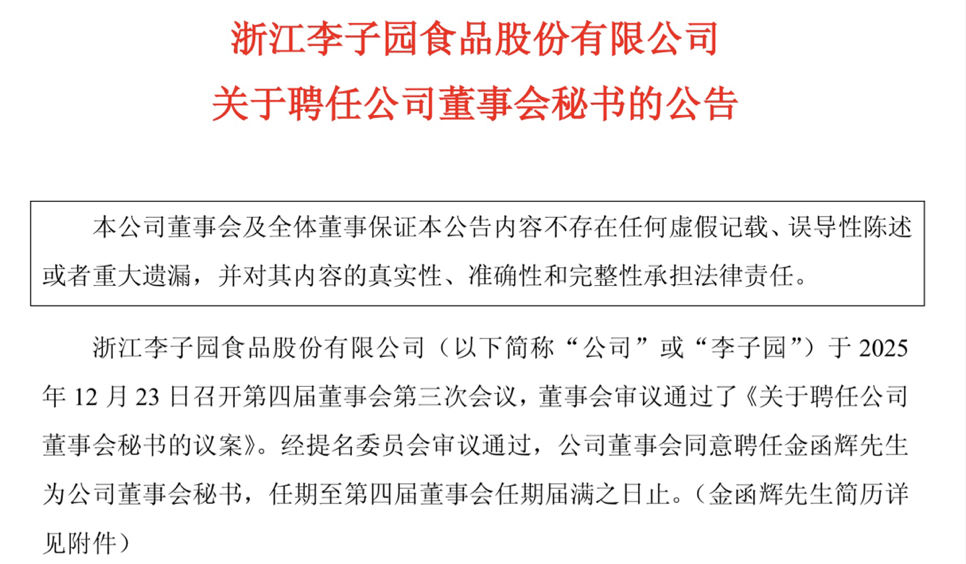 12月23日,李子园召开第四届董事会第三次会议,董事会审议通过了《关于聘任公司董事会秘书的议案》。经提名委员会审议通过,公司董事会同意聘任金函辉为董事会秘书,任期至第四届董事会届满之日止。