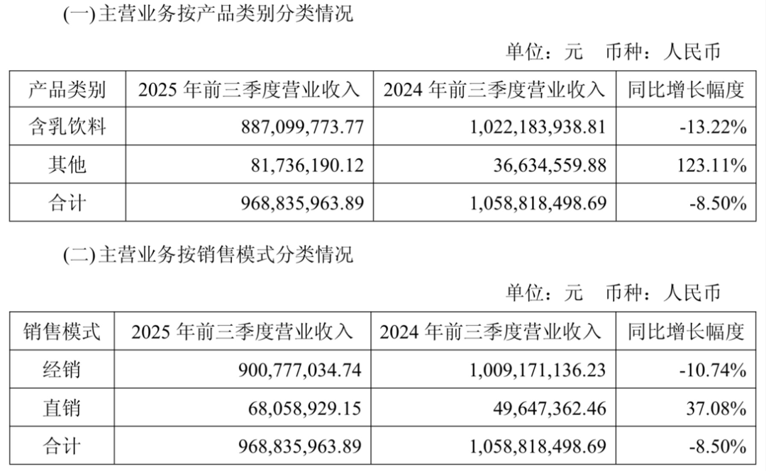 分品类看,公司核心含乳饮料业务因传统渠道需求疲软而持续承压,是整体收入下滑的主要原因之一。2025年前三季度,李子园含乳饮料营收同比下滑13.22%至8.87亿元;其他产品同比增长123.11%至8173.62万元。从销售模式看,期内公司经销收入同比下滑10.74%至9.01亿元;直销渠道同比增长37.08%至6805.89万元。