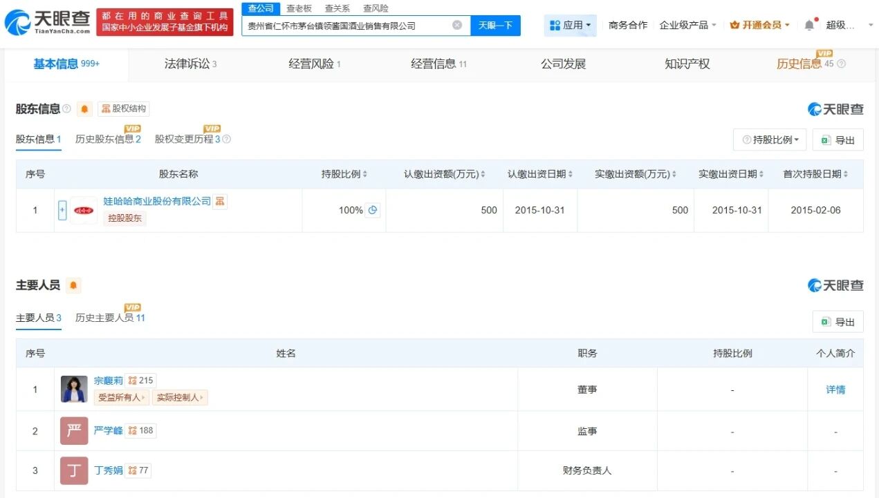 该公司成立于2013年10月,法定代表人为祝丽丹,注册资本500万人民币,由娃哈哈商业股份有限公司全资持股。最终受益人信息显示,宗馥莉为该公司实际控制人。