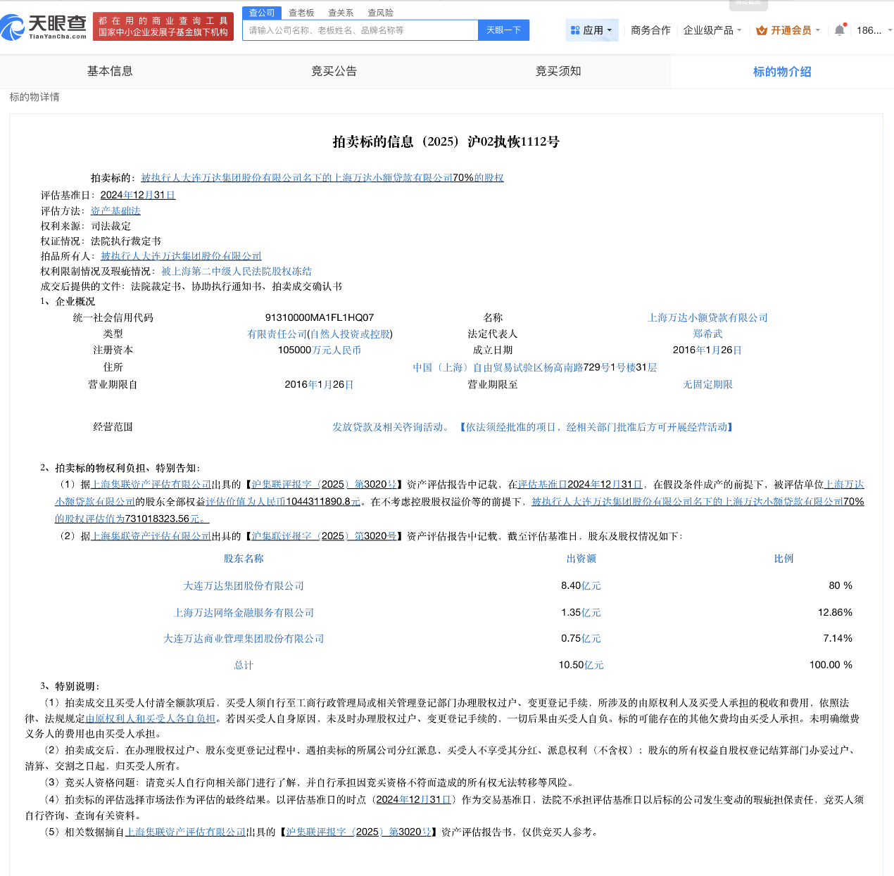天眼查天眼风险信息显示,近日,上海市第二中级人民法院发布拍卖公告,拍卖标的为被执行人大连万达集团股份有限公司名下的上海万达小额贷款有限公司70%的股权。