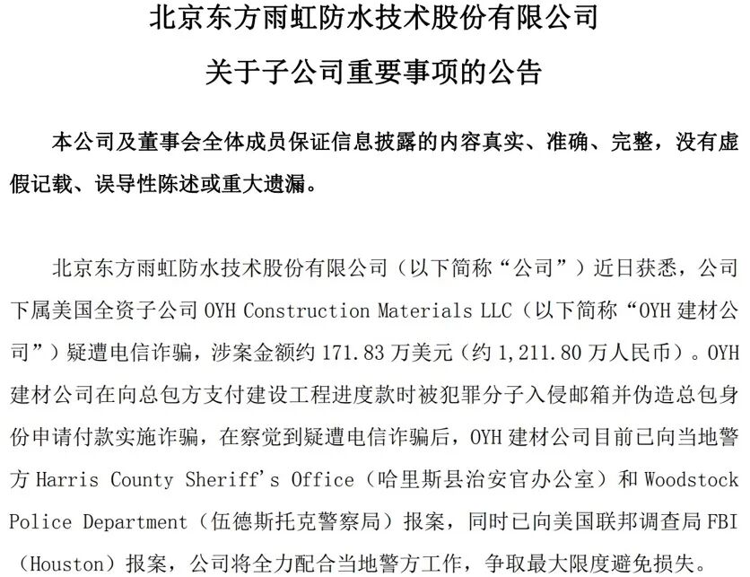 近日,防水行业龙头北京东方雨虹防水技术股份有限公司(下称东方雨虹,002271.SZ)就遭遇了一件棘手的事,其下属美国全资子公司OYH建材公司疑遭电信诈骗,涉案金额约171.83万美元(约1211.80万人民币)。据公司发布的公告详细披露,OYH建材公司在向总包方支付建设工程进度款时,被犯罪分子入侵邮箱并伪造总包身份申请付款实施诈骗。