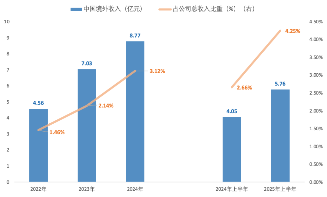 从财务数据来看,近年来,东方雨虹来自其他国家和地区的收入呈现出强劲增长态势,从2022年的4.56亿元一路增至2023年的7.03亿元、2024年的8.77亿元。至2025年上半年,公司境外收入再同比增长42.16%,达到5.76亿元,超过2022年全年规模。并且,海外收入占公司各期总营收比重也有所上升,2025年上半年占比4.25%,较2022年同期(2.28%)增加了1.97个百分点。