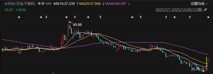 二级市场端,2025年12月25日午后,白酒板块异动,水井坊股价突然拉升涨停,报收于39.80元/股(不复权,下同);但在次日即2025年12月26日,其股价收盘于39.07元/股,下跌近2%。市场情绪回归理性。