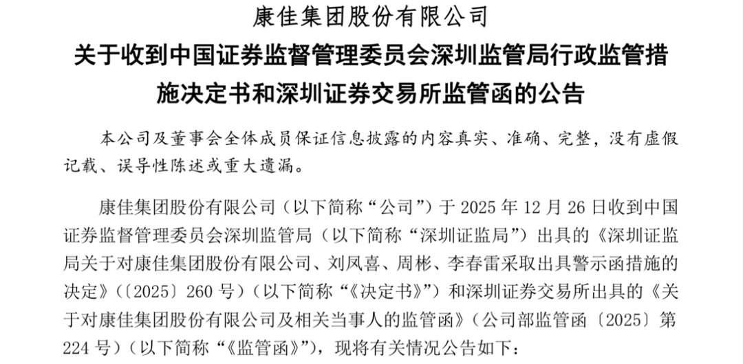 紧接着,深康佳A公告称,公司于12月26日收到深圳证监局出具的《深圳证监局关于对康佳集团股份有限公司、刘凤喜、周彬、李春雷采取出具警示函措施的决定》(下称《决定书》)和深交所出具的《关于对康佳集团股份有限公司及相关当事人的监管函》。