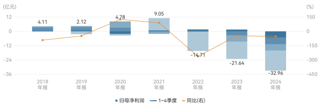 投资时间网、标点财经研究员注意到,自2019年营收达到551.19亿元顶峰后,深康佳A的营收规模便持续下滑。Wind数据显示,2022年至2024年,公司营业收入分别为296.08亿元、178.49亿元和111.15亿元,降幅均接近40%;归母净利润分别为-14.71亿元、-21.64亿元和-32.96亿元,亏损幅度逐年加大。