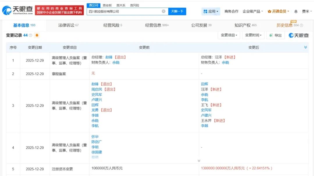 天眼查App显示,近日,四川航空股份有限公司发生工商变更,注册资本由106亿人民币增至130亿人民币,增幅约23%,同时,部分高管发生变更。