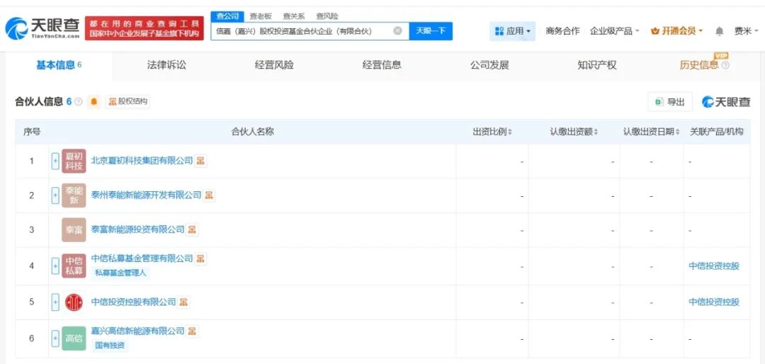 天眼查App显示,12月30日,信嘉(嘉兴)股权投资基金合伙企业(有限合伙)成立,执行事务合伙人为解强,出资额7亿人民币,经营范围为以私募基金从事股权投资、投资管理、资产管理等活动,由中信私募基金管理有限公司、中信投资控股有限公司、北京夏初科技集团有限公司等共同出资。