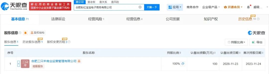 该公司成立于2023年11月,法定代表人为李莹,注册资本100万人民币,经营范围包括个人商务服务、个人互联网直播服务、组织文化艺术交流活动、文化娱乐经纪人服务等。股东信息显示,该公司由合肥三只羊商业运营管理有限公司全资持股。