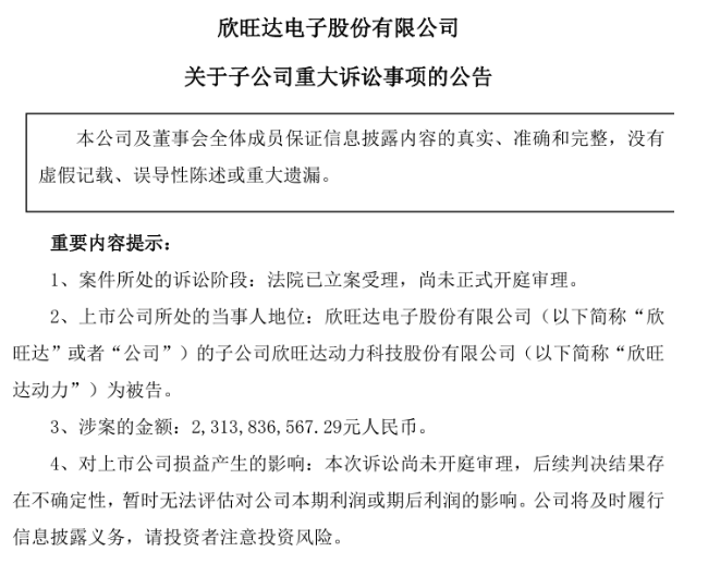 公告显示,欣旺达全资子公司欣旺达动力科技股份有限公司(下称欣旺达动力)被威睿电动汽车技术(宁波)有限公司(下称威睿电动)起诉,内容为欣旺达动力在2021年6月至2023年12月期间交付的动力电池电芯存在质量问题,导致威睿电动遭受重大经济损失,威睿电动向欣旺达动力索赔金额23.14亿元。