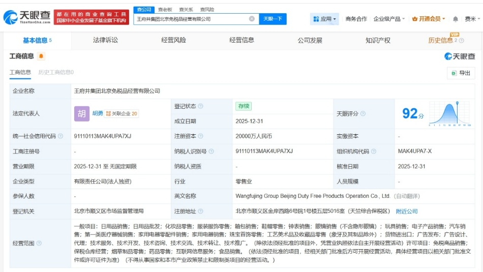 同时,王府井集团北京免税品经营有限公司亦成立,法定代表人为胡勇,注册资本2亿人民币,经营范围包括日用品销售、日用品批发、化妆品零售、服装服饰零售等。股东信息显示,该公司由王府井(600859)全资持股。