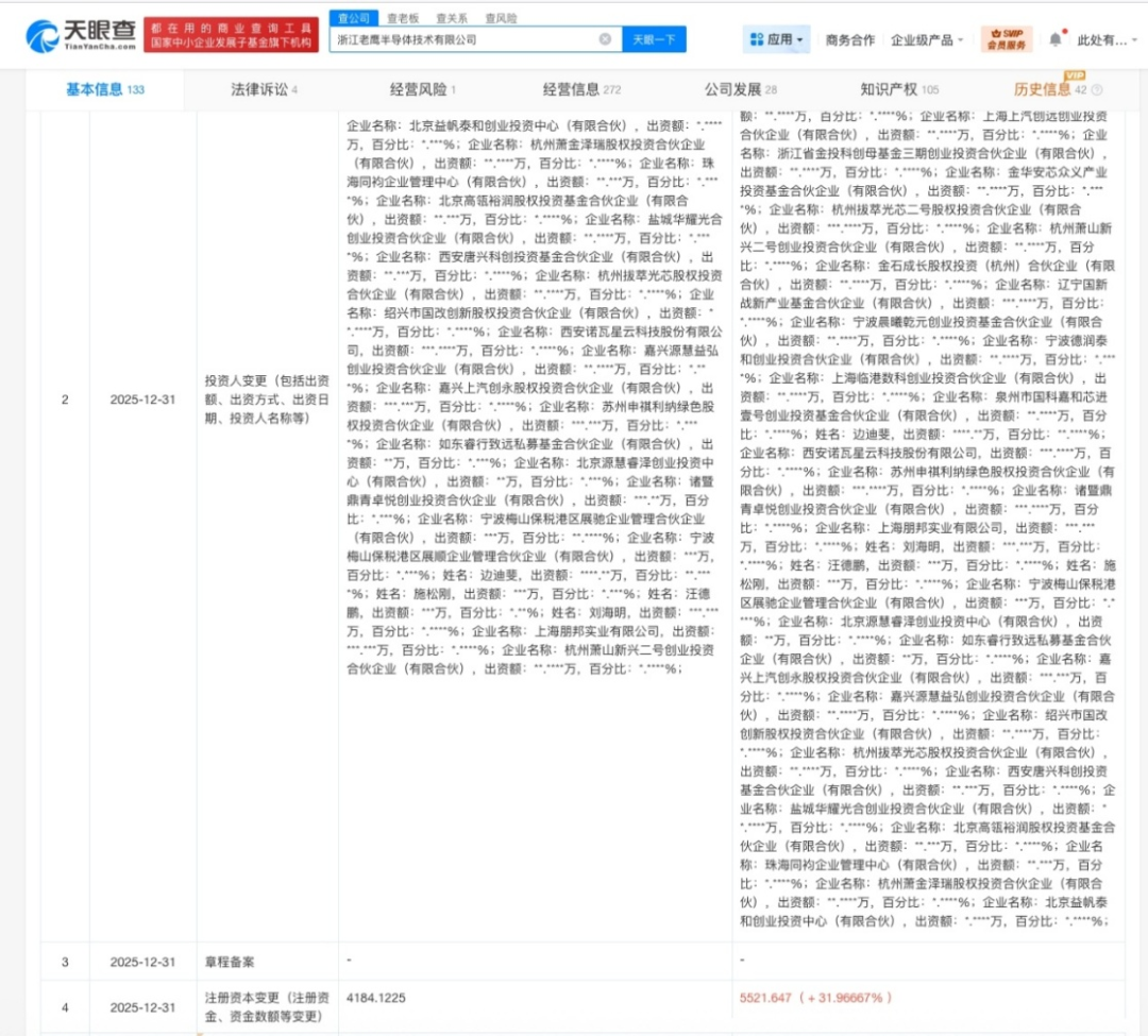 天眼查工商信息显示,近日,浙江老鹰半导体技术有限公司发生工商变更,新增茅台金石(贵州)产业发展基金合伙企业(有限合伙)、上海上汽创远创业投资合伙企业(有限合伙)、深创投中小企业发展基金(苏州)合伙企业(有限合伙)等为股东,注册资本由约4184万人民币增至约5522万人民币,同时,部分高管也发生变更。