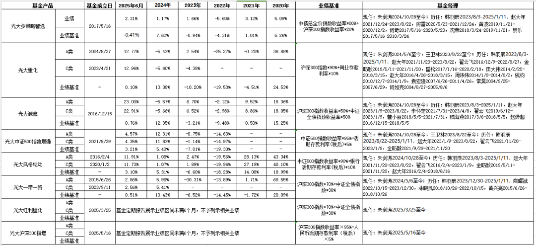 从团队来看,光大保德信基金量化投资团队成员有5人,平均从业经验超8年,这支队伍在管的多只产品业绩位列同类前1/5。比如,光大锦弘A近一年业绩位列同类前11%(34/315);光大诚鑫A近一年业绩位列同类前13%(50/409)。③