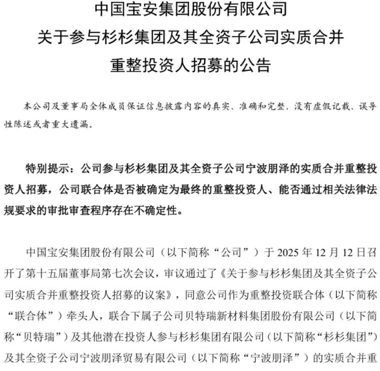 此公告一出,意味着方大炭素给持续了仅40天的参与行动正式画上句号。回看方大炭素的参与过程,2025年11月24日,公司召开第九届董事会第十四次临时会议,审议通过了《关于拟参与杉杉集团及其全资子公司实质合并重整投资人招募的议案》,同意参与上述两家企业的实质合并重整投资人招募,并授权公司管理层开展后续一系列工作。